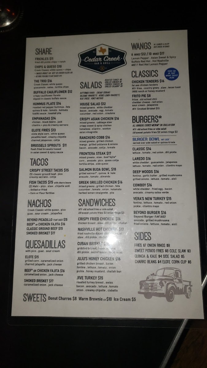 The menu features a range of tempting options, from juicy burgers and flavorful nachos to their standout Thursday Night Special: a 16 oz steak paired with garlic butter, mashed potatoes, and asparagus. While some dishes like the chicken tenders and side salads receive rave reviews, the quality of the steak has faced criticism. However, the inviting ambiance, friendly staff, and charm of Cedar Creek keep guests coming back for more, ensuring that there's always something to enjoy at this beloved local hotspot.